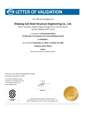 The company has a comprehensive quality assurance system and has passed the certification of ISO9001:2015 quality assurance system. Having the second level general contracting qualification for construction projects, the first level professional contracting qualification for steel structures, and the special manufacturing qualification issued by the Ministry of Construction. We specialize in undertaking the construction of various industrial and civil engineering projects, as well as the design, manufacturing, and installation of steel structures. The company is based in the domestic market and has established multiple marketing offices nationwide, gradually forming a nationwide marketing network and actively participating in international competition. The company has the Canadian CWB certificate, CSA A660-10, American AISC certificate, European EN1090 and ISO3834 certificate certified by the Canadian Welding Association, and can undertake the export processing of steel components with special requirements from Europe, America, Australia, and other countries. It has successfully established branches in Madagascar and Botswana in Africa. Jiuli Steel Structure is one of the first construction enterprises in the Huzhou region to enter the international market.