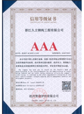Zhejiang Jiuli Steel Structure Engineering Co., Ltd., founded in February 2001, is based in Huzhou City, the core area of the booming economy of the Yangtze River Delta in China. As a wholly-owned subsidiary of Jiuli Group, our company has not only been awarded honors such as Contract-abiding and Credit-worthy Unit, High-tech Enterprise, and AAA Credit Enterprise in Huzhou City but also holds important memberships in the China Steel Structure Association and the Steel Structure Branch of the Zhejiang Construction Industry Association, demonstrating our authoritative position and outstanding influence in the industry.