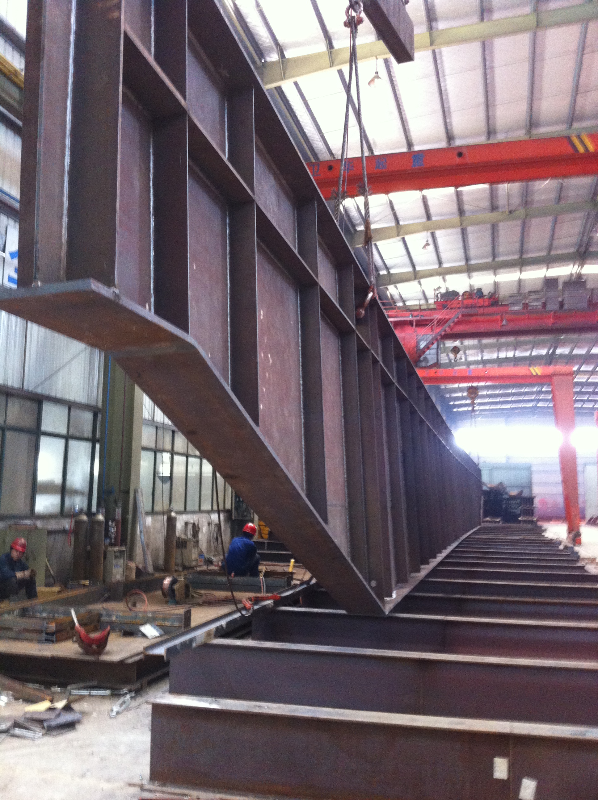 該吊車(chē)梁跨度大(45m),尺寸大(寬0.4m、高3.2m),重量大(35t),在冶金工業(yè)廠(chǎng)房施工中極為少見(jiàn),給制作、安裝帶來(lái)極大的難度。對該吊車(chē)梁起拱控制、加工余量控制、H型鋼的組立、焊接等關(guān)鍵點(diǎn)控制正是擺在久立鋼構員工面前的一個(gè)又一個(gè)實(shí)實(shí)在在的難題,面對前所未有的挑戰,久立鋼構從上至下高度重視,精心安排,周密組織,公司領(lǐng)導和各部門(mén)通力協(xié)作,密切配合,工人們加班加點(diǎn),忘我地拼裝和焊接,送走了一個(gè)個(gè)無(wú)眠之夜。在吊車(chē)梁桁架制作中還克服了數個(gè)高難度加工項目構件同時(shí)制作、工期緊的矛盾,歷經(jīng)一個(gè)多月,終于趕在吊裝前夕全部完成各項準備,最終確保工程按期成功整體提升。